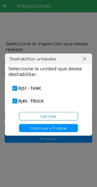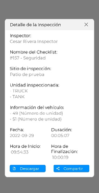 Tras determinar si deshabilitar las unidades o no, aparecerá una opción para ver la inspección, al seleccionar esa opción se visualiza un resumen de está mostrando las unidades inspeccionadas, quién hizo la inspección, la fecha de esta, el tiempo que duró entre otros datos, la app cuenta con la opción de descargar el archivo PDF de la inspección directamente sin necesidad de acceder a la versión web y también se puede compartir sin problemas a cualquier medio que tenga el celular o Tablet como puede ser por WhatsApp, Microsoft Teams, por correo, por bluetooth, etc.