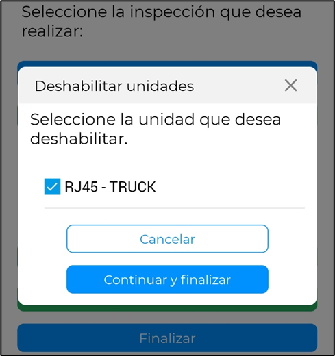 En este caso, la unidad que se inspeccionó fue la unidad tipo “Truck” cuya placa es “RJ45”, y como se puede ver en la imagen de abajo, se deshabilitó dicha unidad.